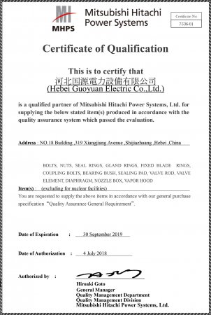 三菱日立電力系統(tǒng)合格供方證書(shū)
